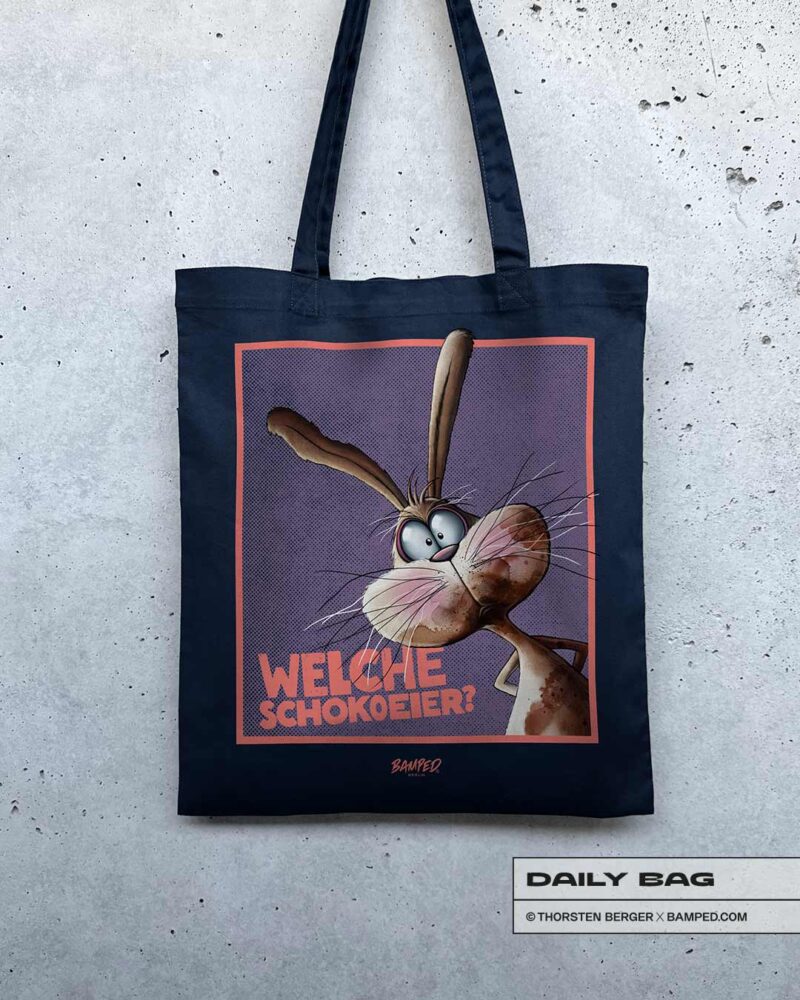 - Motiv: Dieses knuffige Langohr ist eine wahre Naschkatze, äh, Naschhase mit Schmunzelgarantie. Der gerasterte Hintergrund belebt das grafische Motiv und setzt die Schokuschnute plakativ in Szene.